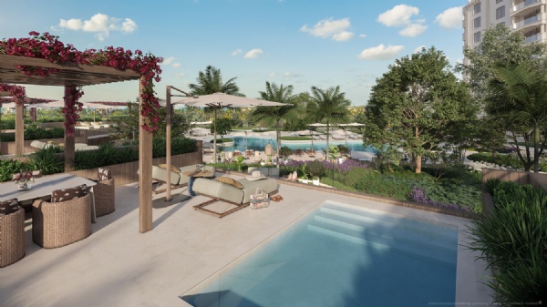 Two resort-style swimming pools, perfect for sunrise and sunset views, with sunbeds and cabanas for poolside lounging and dining service.