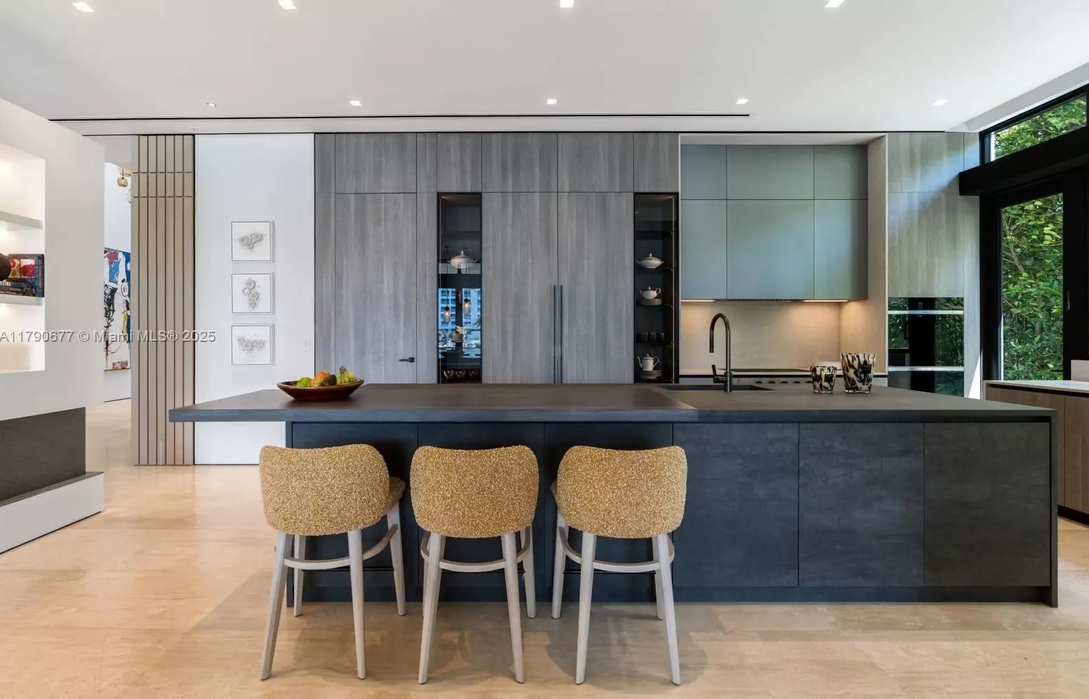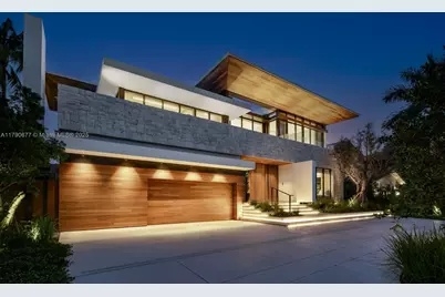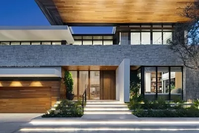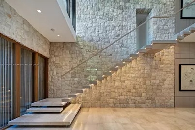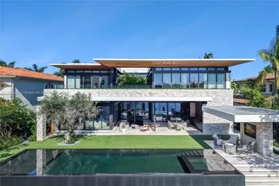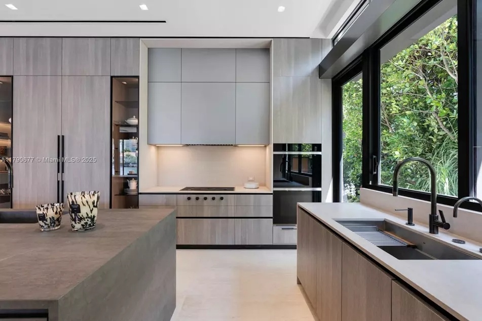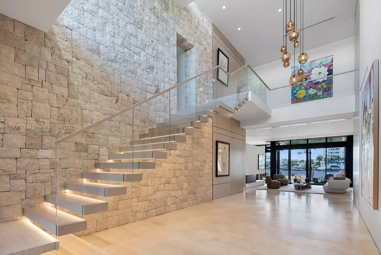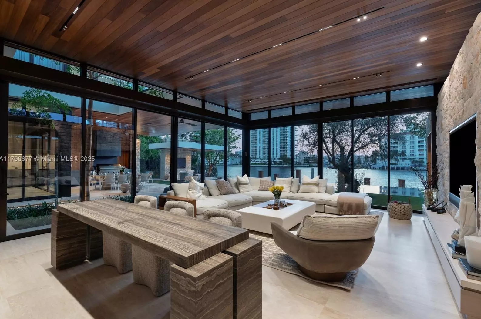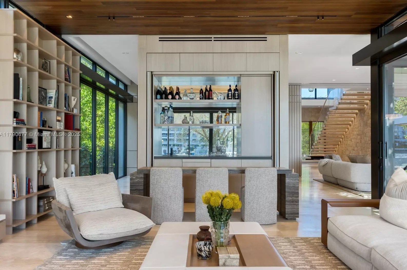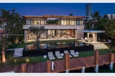Glamour in Golden Beach! Masterfully designed, this 2025 residence sets a new benchmark in waterfront modernism. Hand-placed stone, iroko wood, and clear glass interlace a 100-year olive tree. The grand foyer achieves 24' heights highlighting Italian oak-paneled walls that lead to a sophisticated salon. Curated by Fanny Haim, the worldly interiors include a travertine bar in the bespoke media lounge, and stylized fireplaces & drapery throughout. The exceptional MiaCucina kitchen revolves around a bright breakfast area. An architectural staircase arrives to the primary suite's dual dressing rooms and spacious marble bath enhanced by an upstairs library. A theater, office, gym, elevator & staff room complete the home. The resort pool shines with a cabana, Summer Kitchen, new dock + seawall.