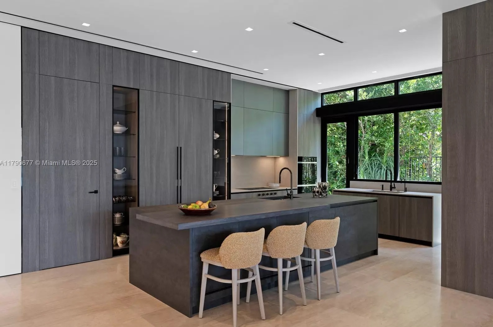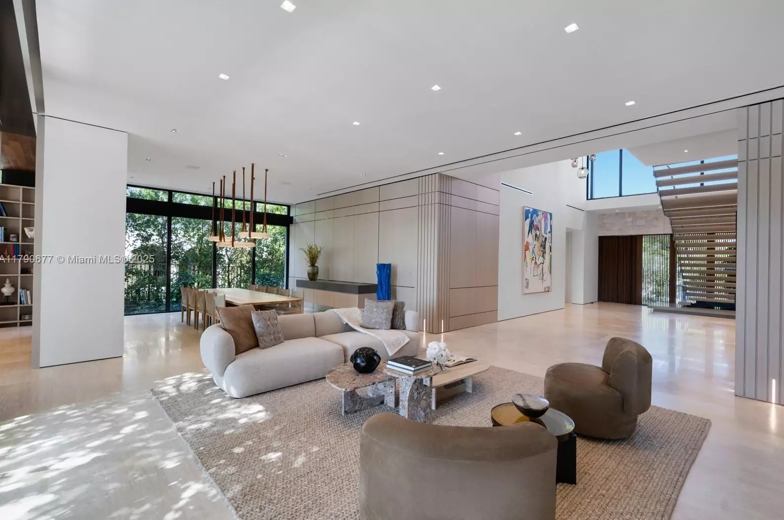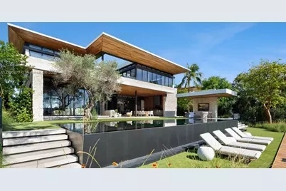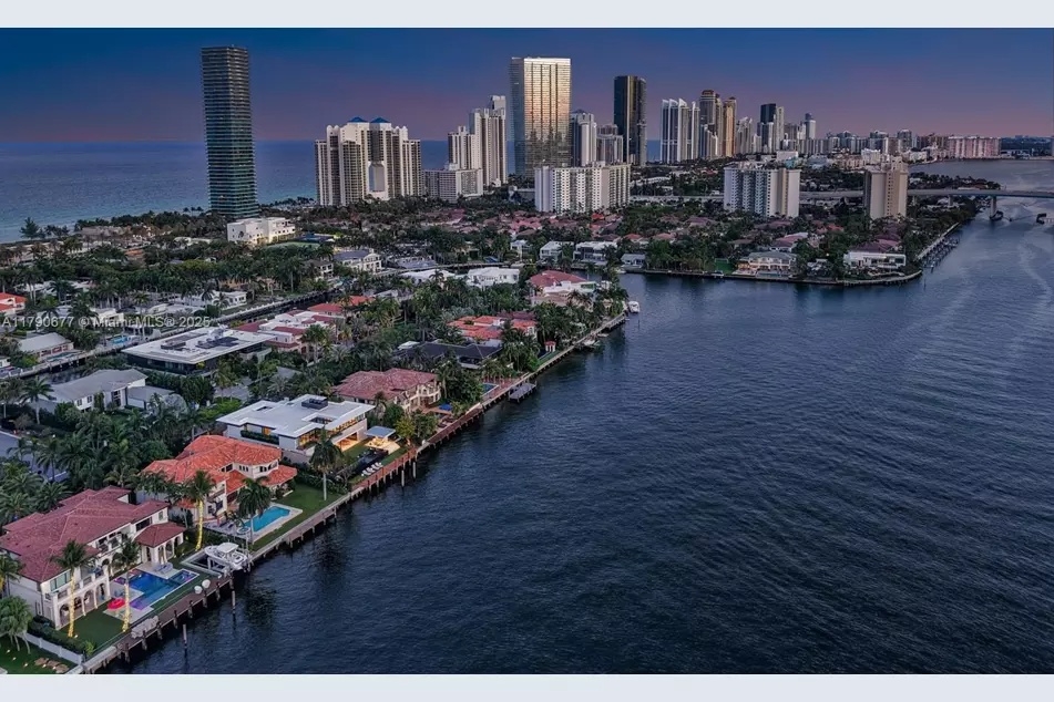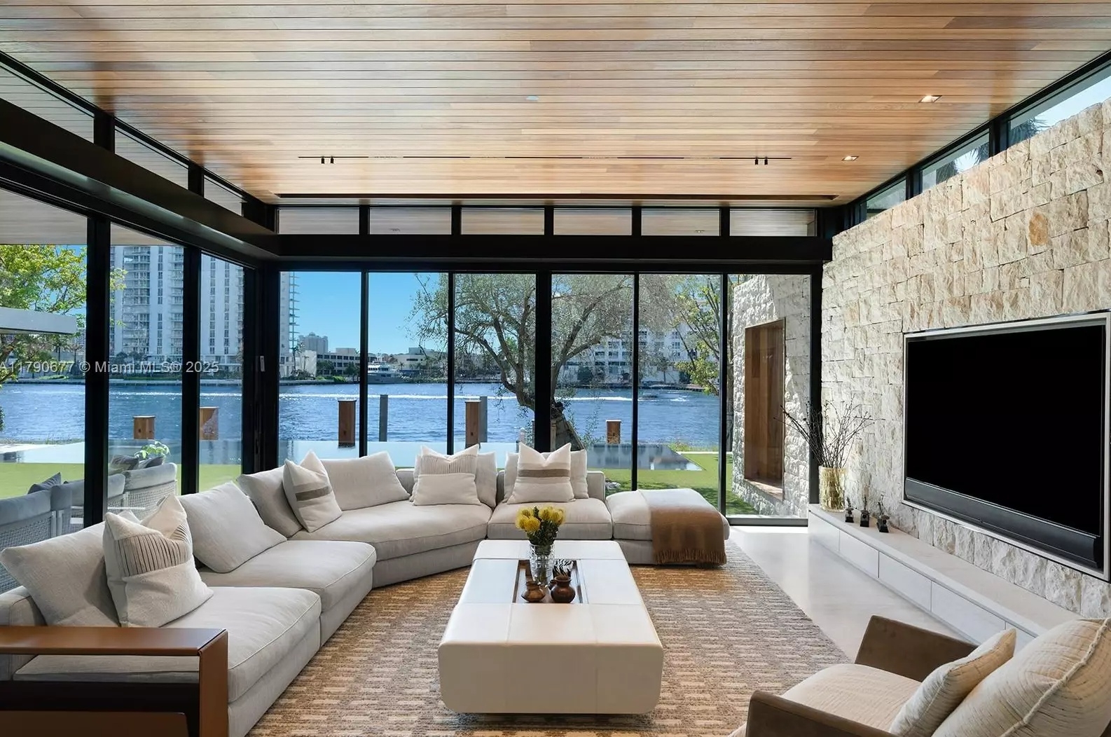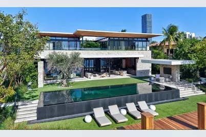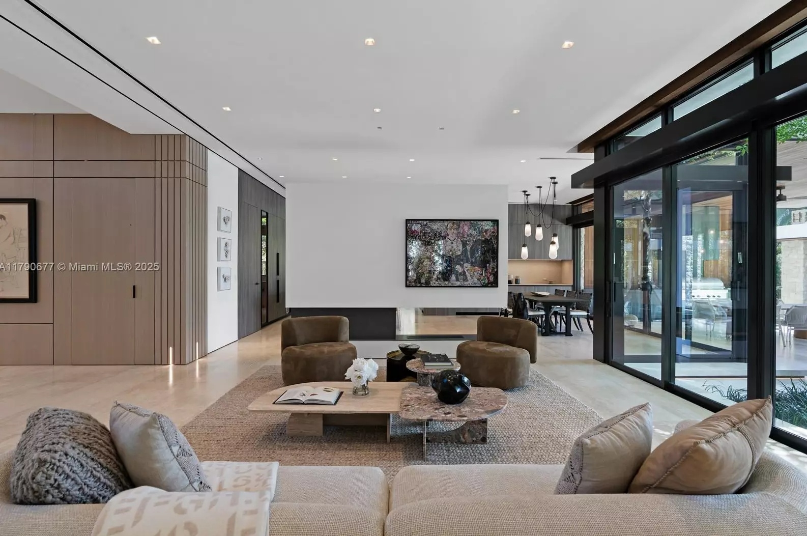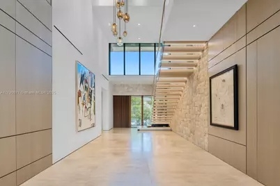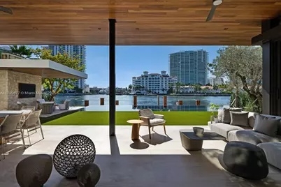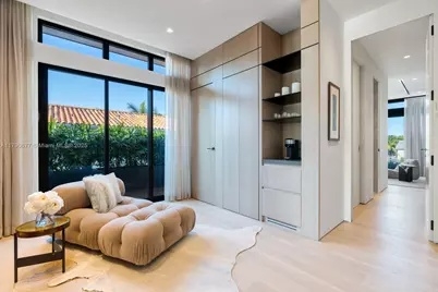 Glamour in Golden Beach! Masterfully designed, this 2025 residence sets a new benchmark in waterfront modernism. Hand-placed stone, iroko wood, and clear glass interlace a 100-year olive tree. The grand foyer achieves 24' heights highlighting Italian oak-paneled walls that lead to a sophisticated salon. Curated by Fanny Haim, the worldly interiors include a travertine bar in the bespoke media lounge, and stylized fireplaces & drapery throughout. The exceptional MiaCucina kitchen revolves around a bright breakfast area. An architectural staircase arrives to the primary suite's dual dressing rooms and spacious marble bath enhanced by an upstairs library. A theater, office, gym, elevator & staff room complete the home. The resort pool shines with a cabana, Summer Kitchen, new dock + seawall.