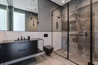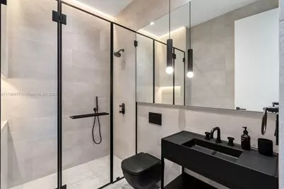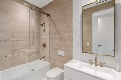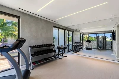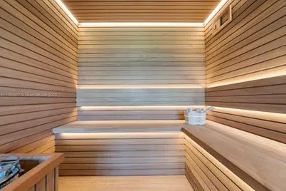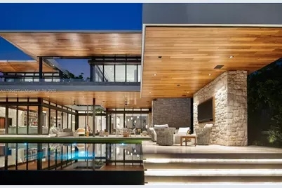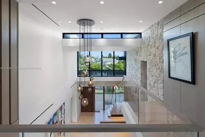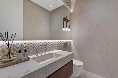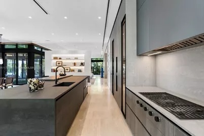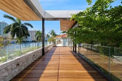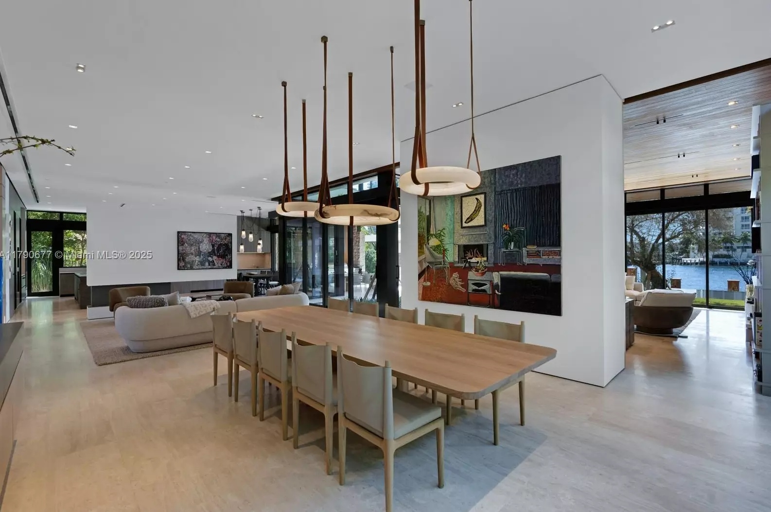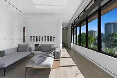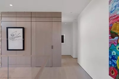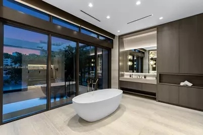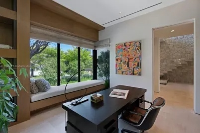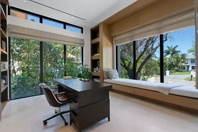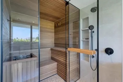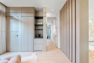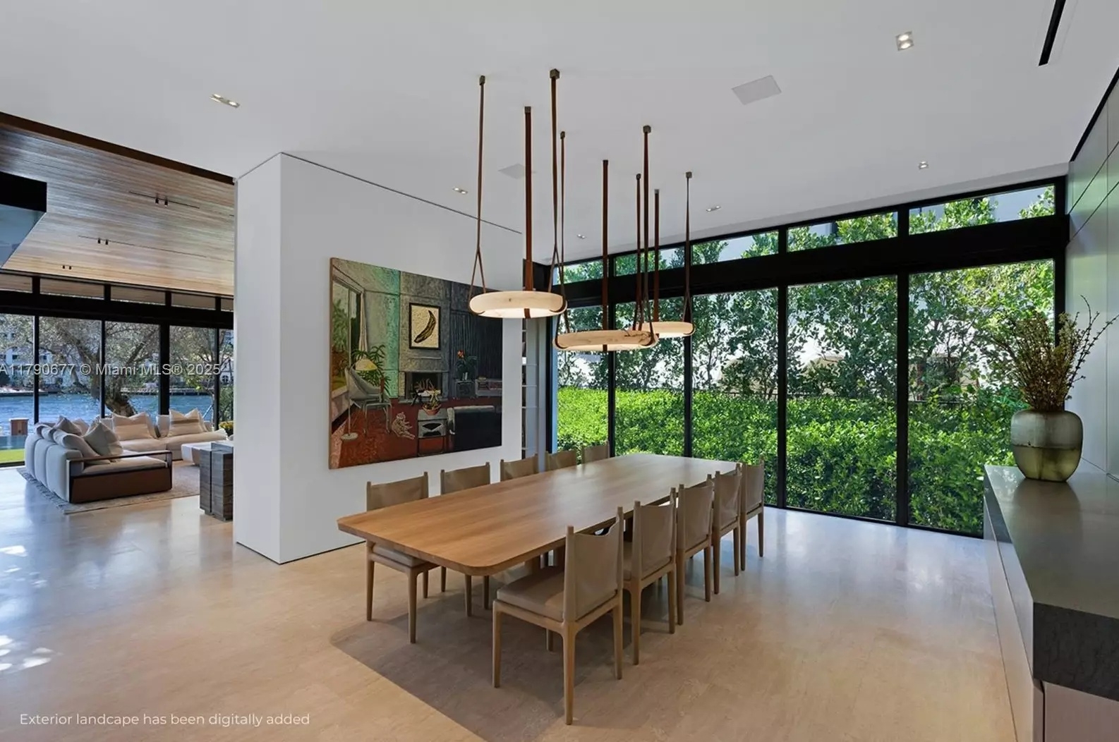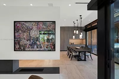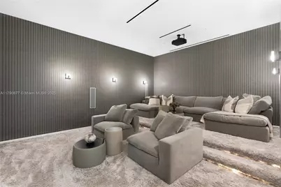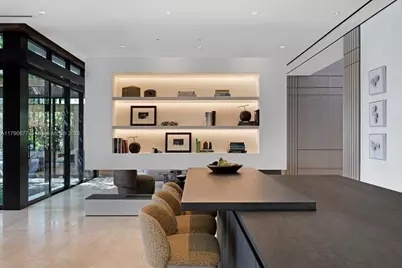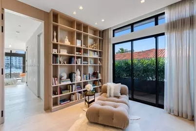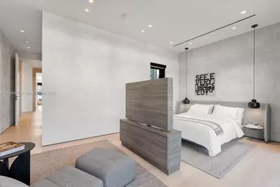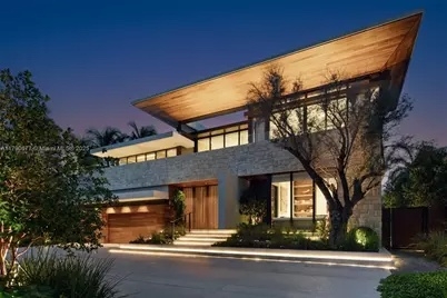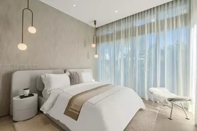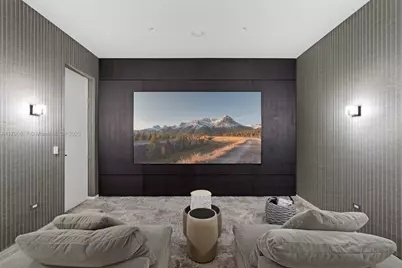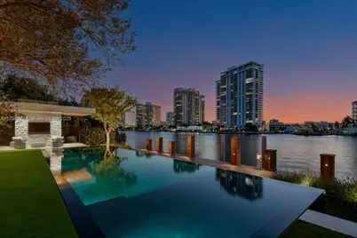 Glamour in Golden Beach! Masterfully designed, this 2025 residence sets a new benchmark in waterfront modernism. Hand-placed stone, iroko wood, and clear glass interlace a 100-year olive tree. The grand foyer achieves 24' heights highlighting Italian oak-paneled walls that lead to a sophisticated salon. Curated by Fanny Haim, the worldly interiors include a travertine bar in the bespoke media lounge, and stylized fireplaces & drapery throughout. The exceptional MiaCucina kitchen revolves around a bright breakfast area. An architectural staircase arrives to the primary suite's dual dressing rooms and spacious marble bath enhanced by an upstairs library. A theater, office, gym, elevator & staff room complete the home. The resort pool shines with a cabana, Summer Kitchen, new dock + seawall.