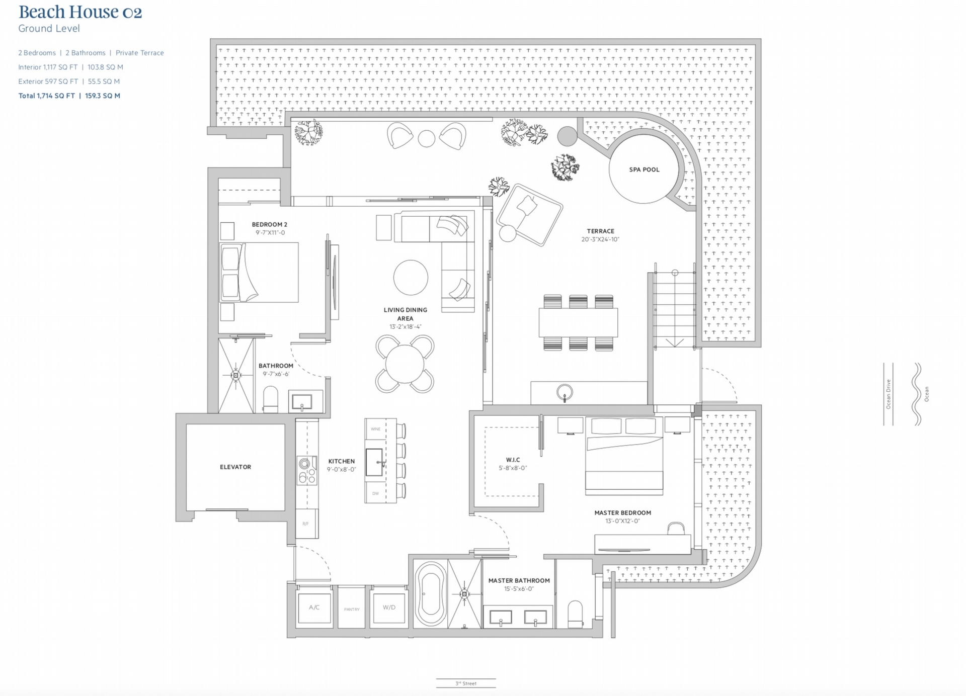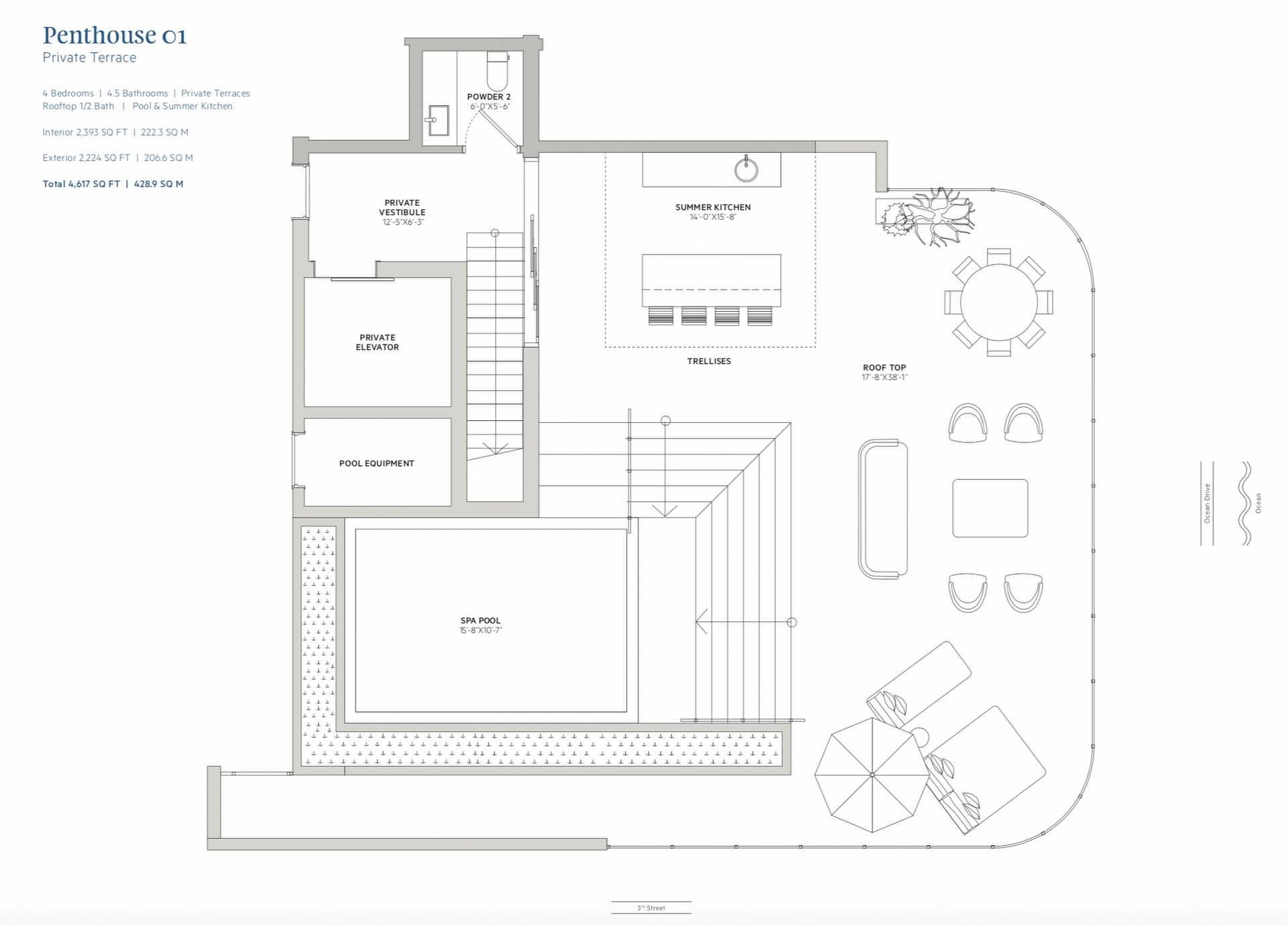 • Penthouse rooftop deck featuring a private spa pool, summer kitchen and dedicated powder room