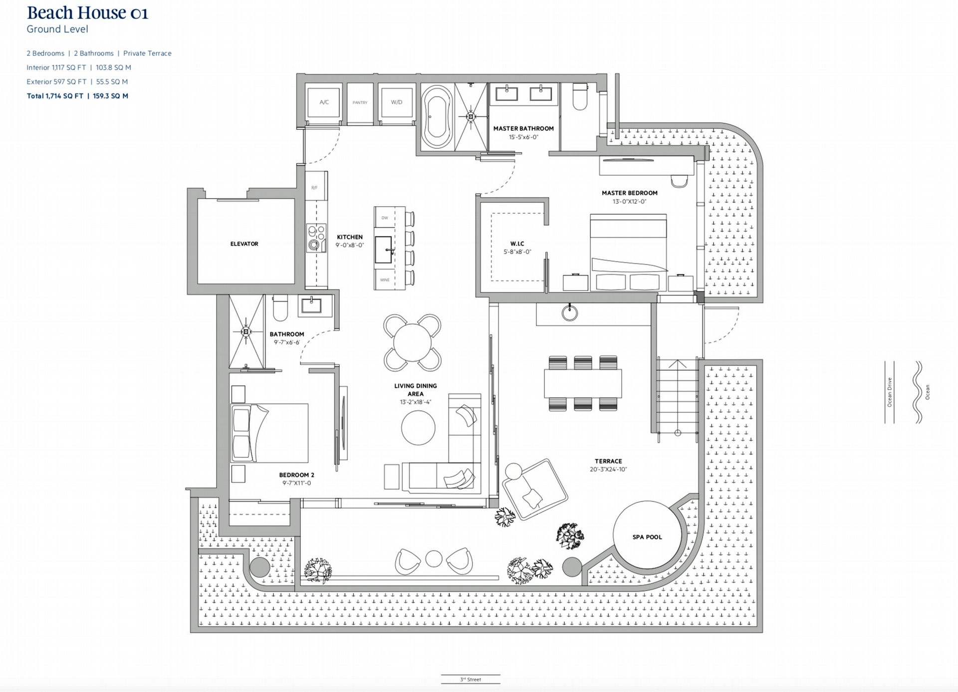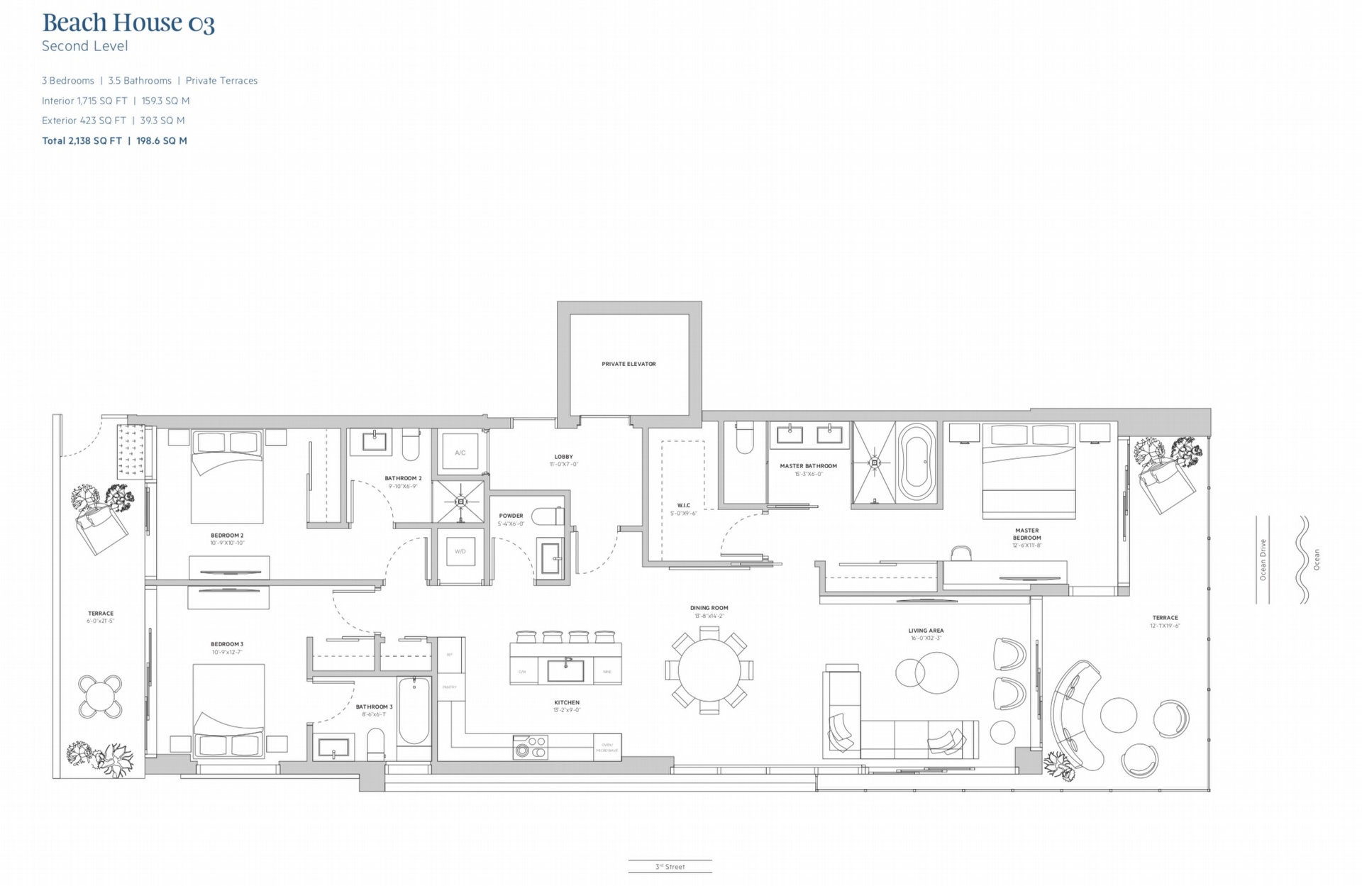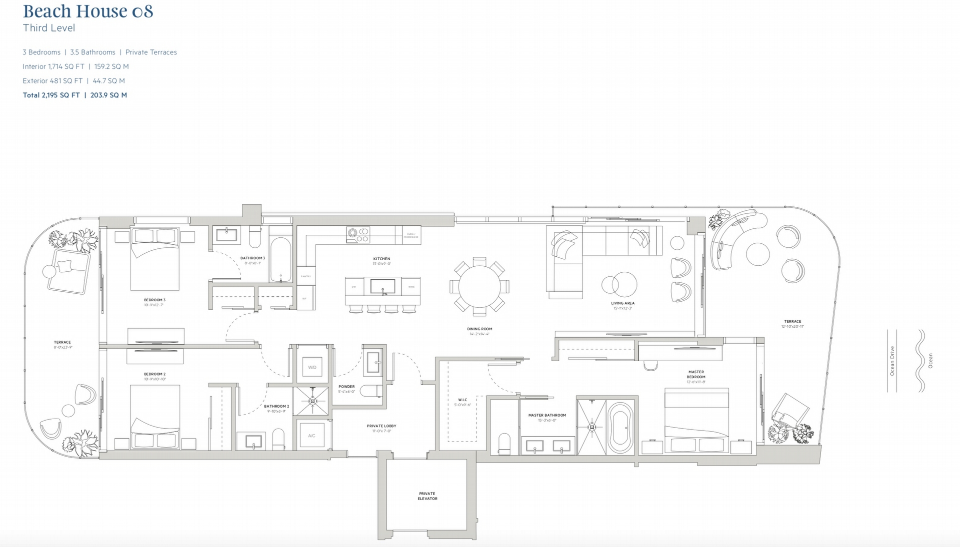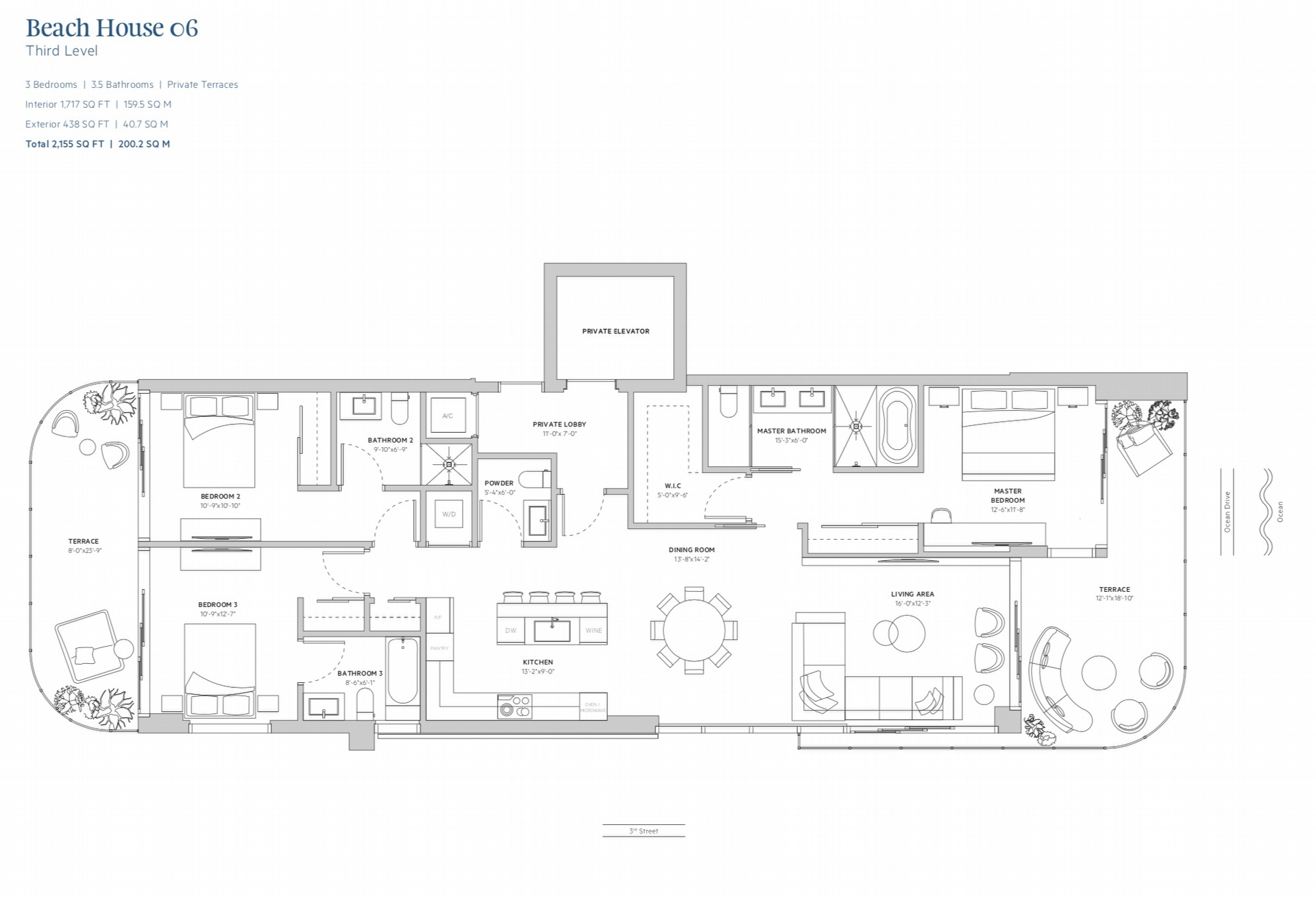 Ocean Park South Beach floorplans range from 1,117 to 1,715 square feet, with large terraces providing an additional 267 to 1,194 square feet of outdoor living space. The penthouses will have 2,393 square feet of interior space and 1,564 square feet of terrace space.